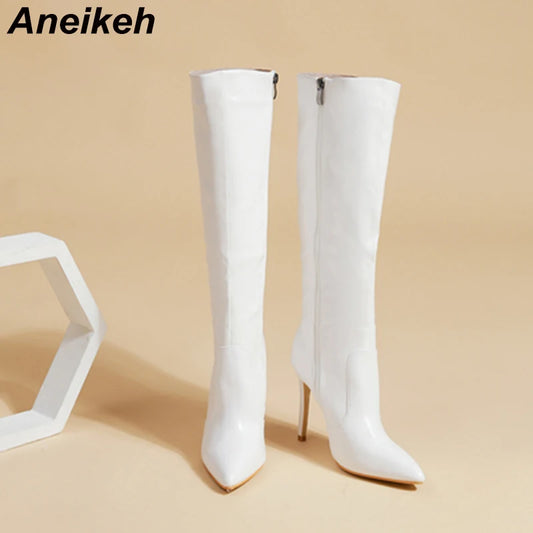 Aneikeh Women's Fashion Elegant Pointed Thin Heel Knee High Long Boots2024 Spring/Autumn PU Panel Side Zipper Boots Western35-42